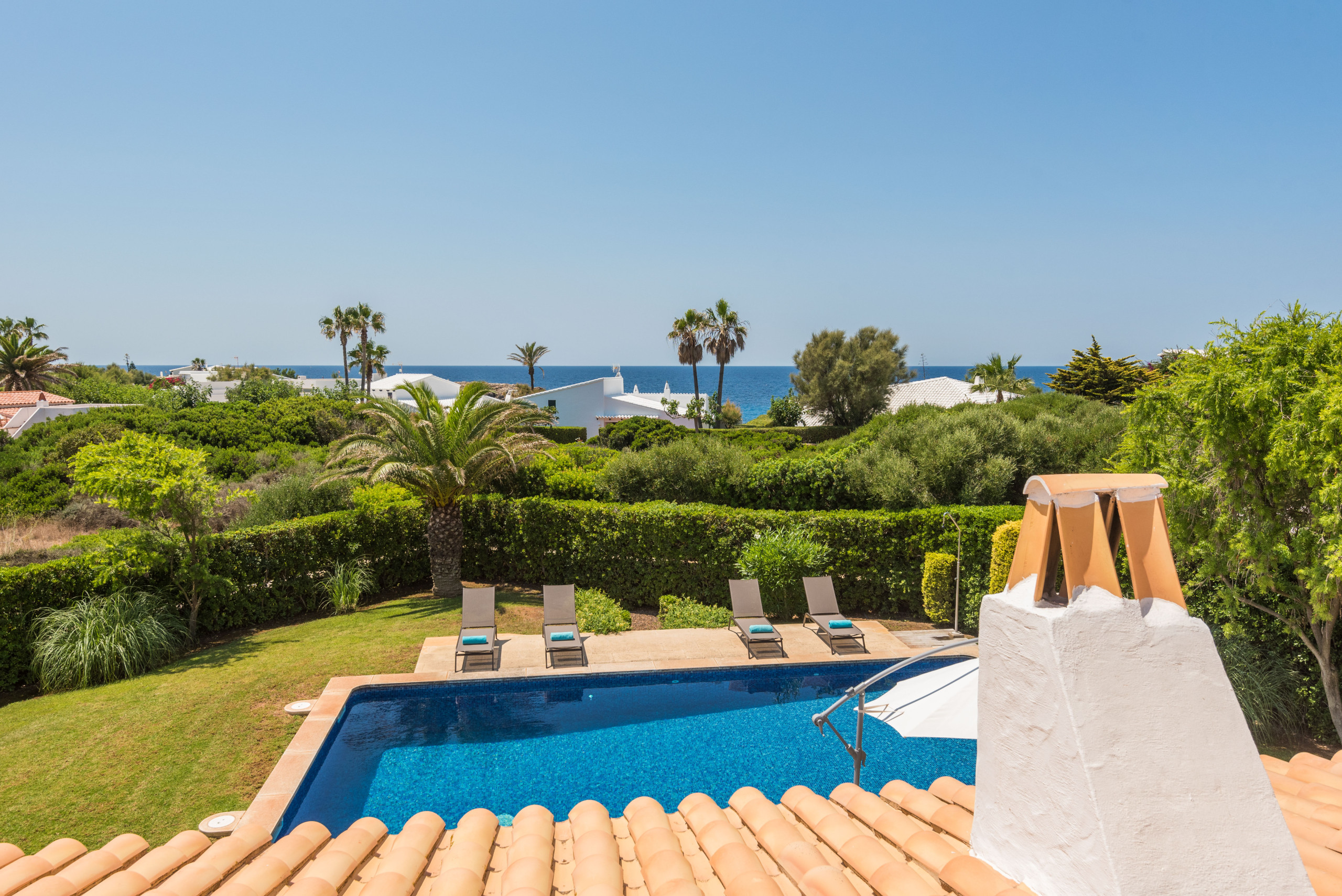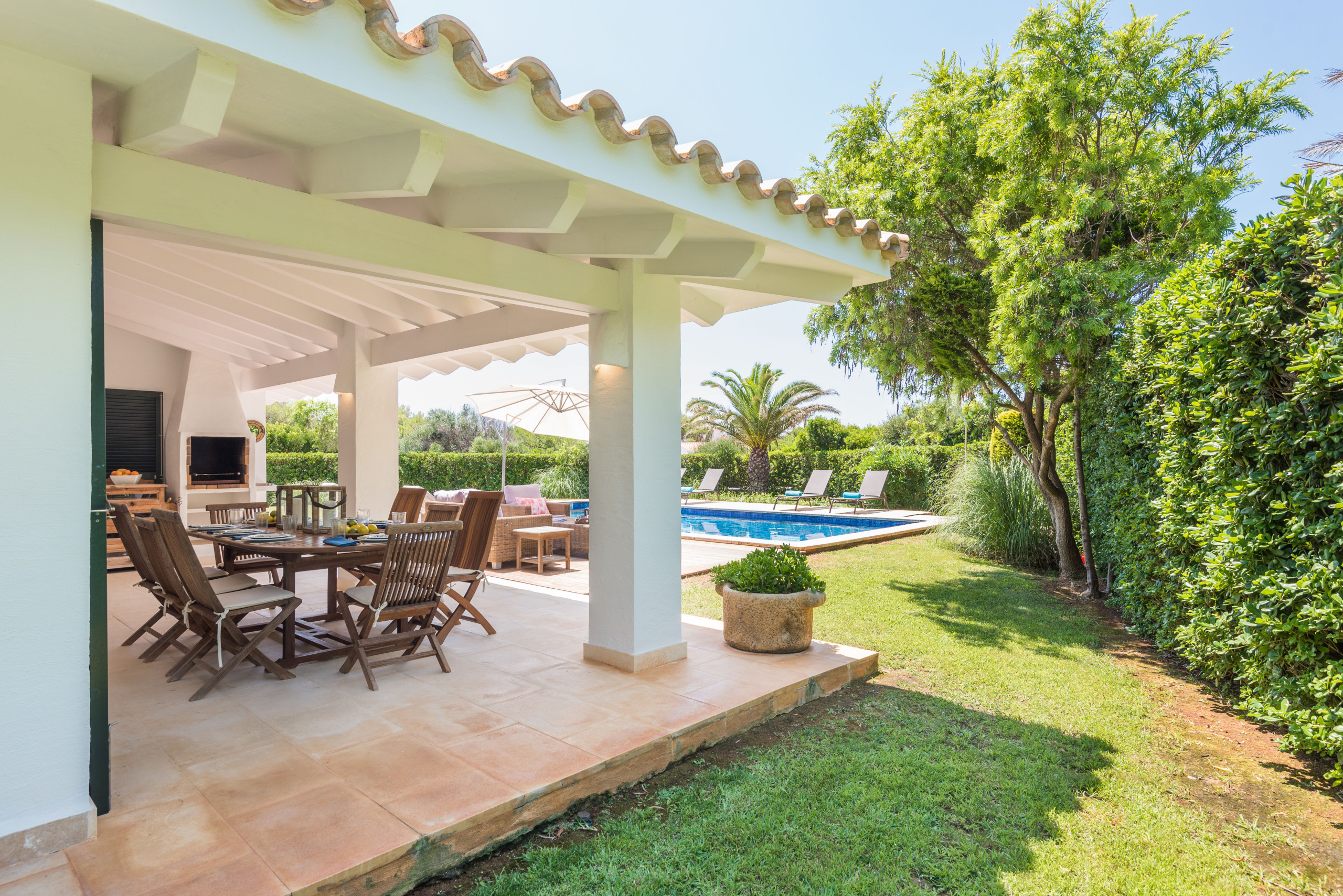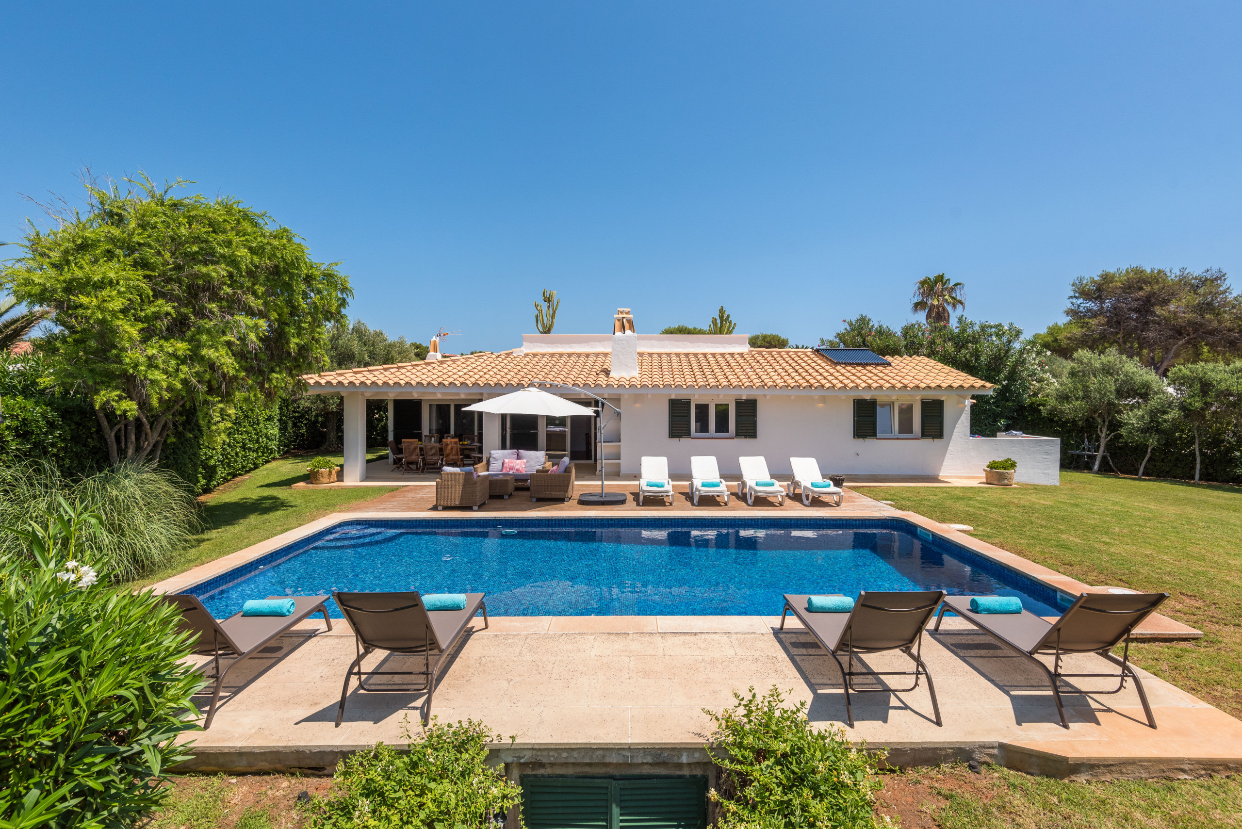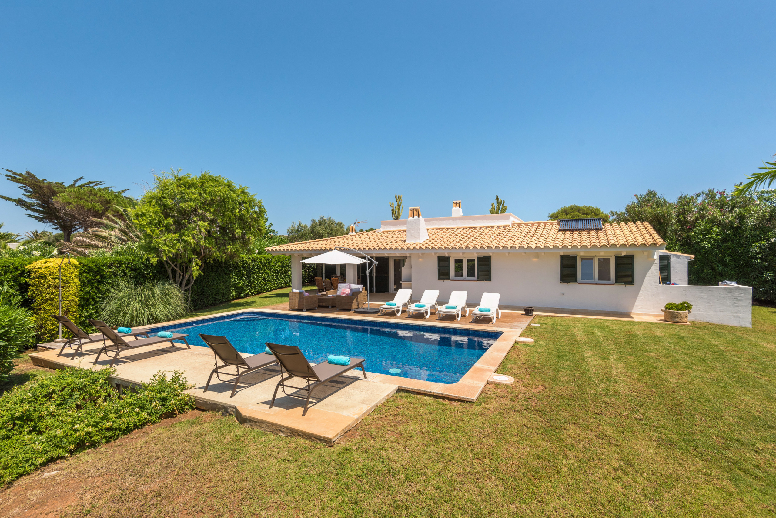 ¡La alegría de vivir! Villa Sirena te da muchas posibilidades y múltiples espacios para vivir tu estancia en Menorca al máximo, habrá varias opciones para cada miembro de la familia, cada uno del grupo podrá encontrar su sitio favorito: el fantástico jardín de más de 1000 metros cuadrados, como ya quedan pocos, con su verde césped, sus setos, flores y árboles, para los adultos un símbolo del descanso en intimidad, para los pequeños de la familia mucho espacio para corretear a gusto y con total seguridad; la terraza solárium, una parte en elegante madera, la otra embaldosada, con sus tumbonas e incluso con sofá y mesa para tomar un aperitivo; la generosa piscina, no sólo para el chapuzón que te refresca después de tomar el sol o al regresar de un día entero en la playa, sino suficientemente grande para nadar y jugar toda la familia; muy extraordinaria la fantástica terraza en la azotea, con ambiente chill-out, cama balinesa y vista mar, para que respires este aire especial, sientas el lujo de la libertad, sea de noche o de día; la espaciosa terraza cubierta, con una mesa para hasta 10 ó 12 comensales para desayunar, almorzar y cenar allí, y que cobija una barbacoa de obra con chimenea, para los verdaderos amantes de la barbacoa, apta para usarla con cualquier tiempo, haga un sol de justicia o llueva.