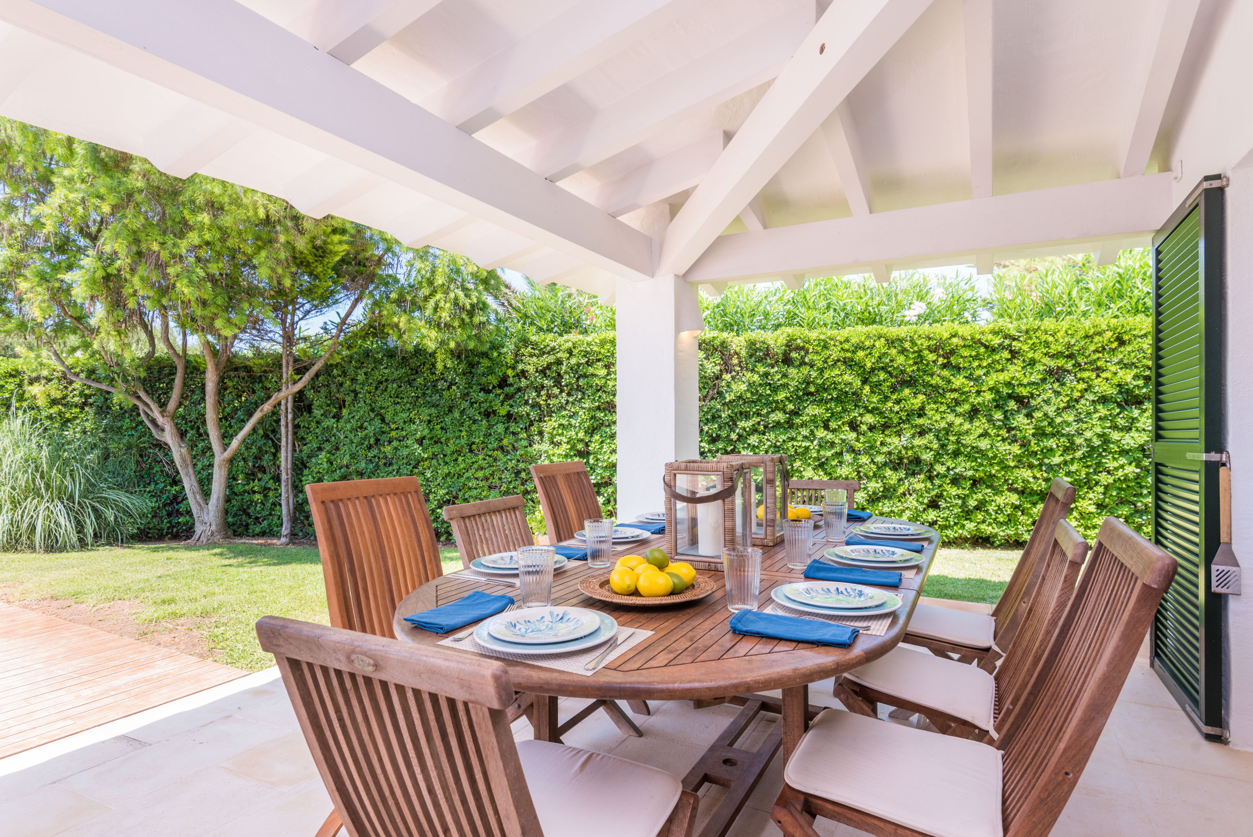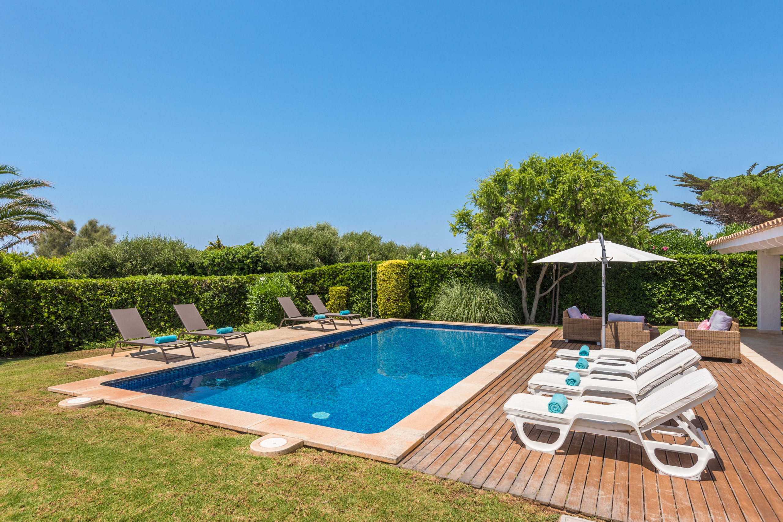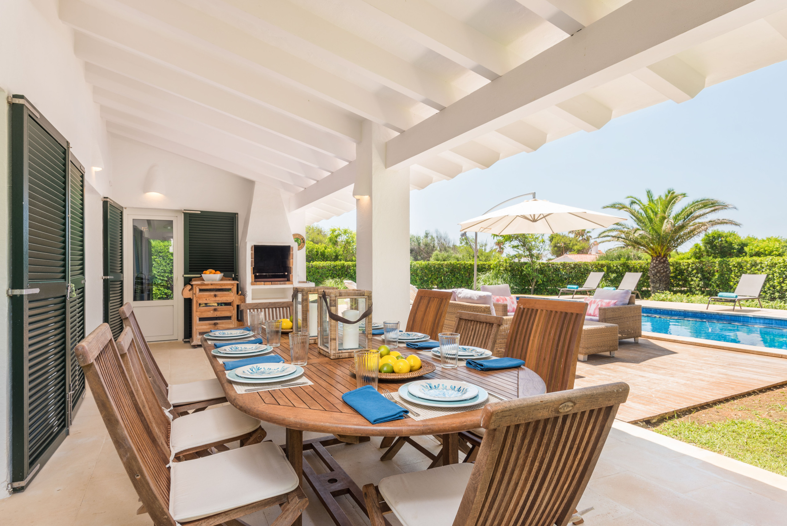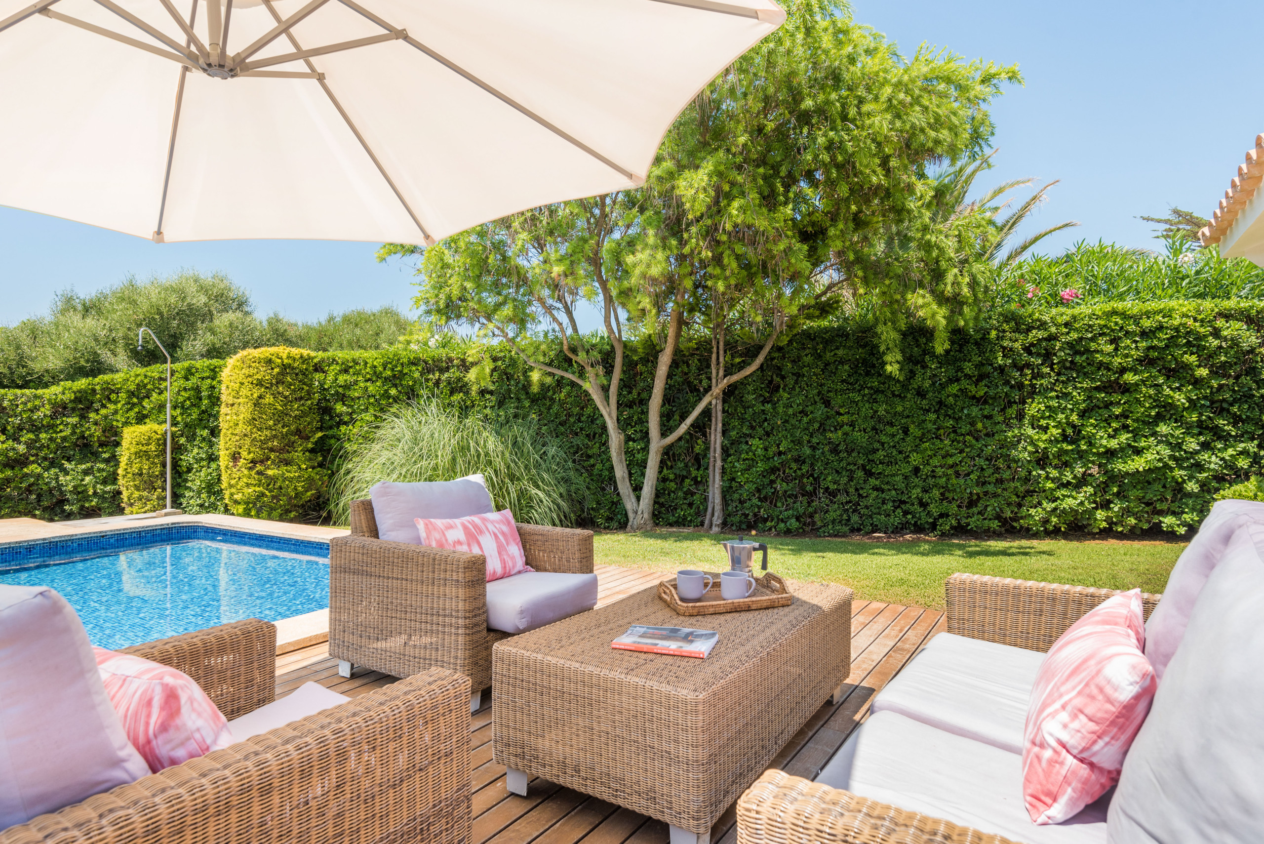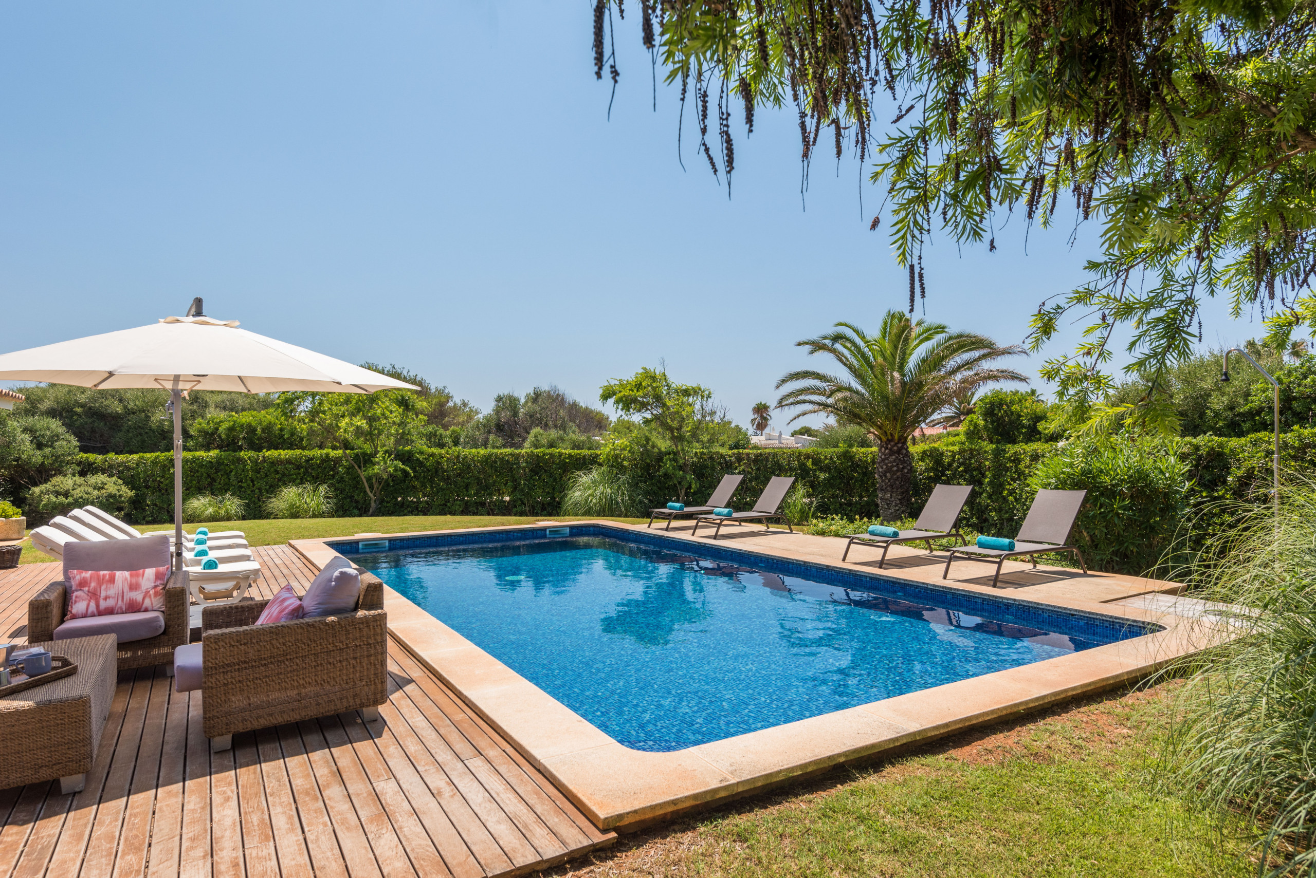 ¡La alegría de vivir! Villa Sirena te da muchas posibilidades y múltiples espacios para vivir tu estancia en Menorca al máximo, habrá varias opciones para cada miembro de la familia, cada uno del grupo podrá encontrar su sitio favorito: el fantástico jardín de más de 1000 metros cuadrados, como ya quedan pocos, con su verde césped, sus setos, flores y árboles, para los adultos un símbolo del descanso en intimidad, para los pequeños de la familia mucho espacio para corretear a gusto y con total seguridad; la terraza solárium, una parte en elegante madera, la otra embaldosada, con sus tumbonas e incluso con sofá y mesa para tomar un aperitivo; la generosa piscina, no sólo para el chapuzón que te refresca después de tomar el sol o al regresar de un día entero en la playa, sino suficientemente grande para nadar y jugar toda la familia; muy extraordinaria la fantástica terraza en la azotea, con ambiente chill-out, cama balinesa y vista mar, para que respires este aire especial, sientas el lujo de la libertad, sea de noche o de día; la espaciosa terraza cubierta, con una mesa para hasta 10 ó 12 comensales para desayunar, almorzar y cenar allí, y que cobija una barbacoa de obra con chimenea, para los verdaderos amantes de la barbacoa, apta para usarla con cualquier tiempo, haga un sol de justicia o llueva.